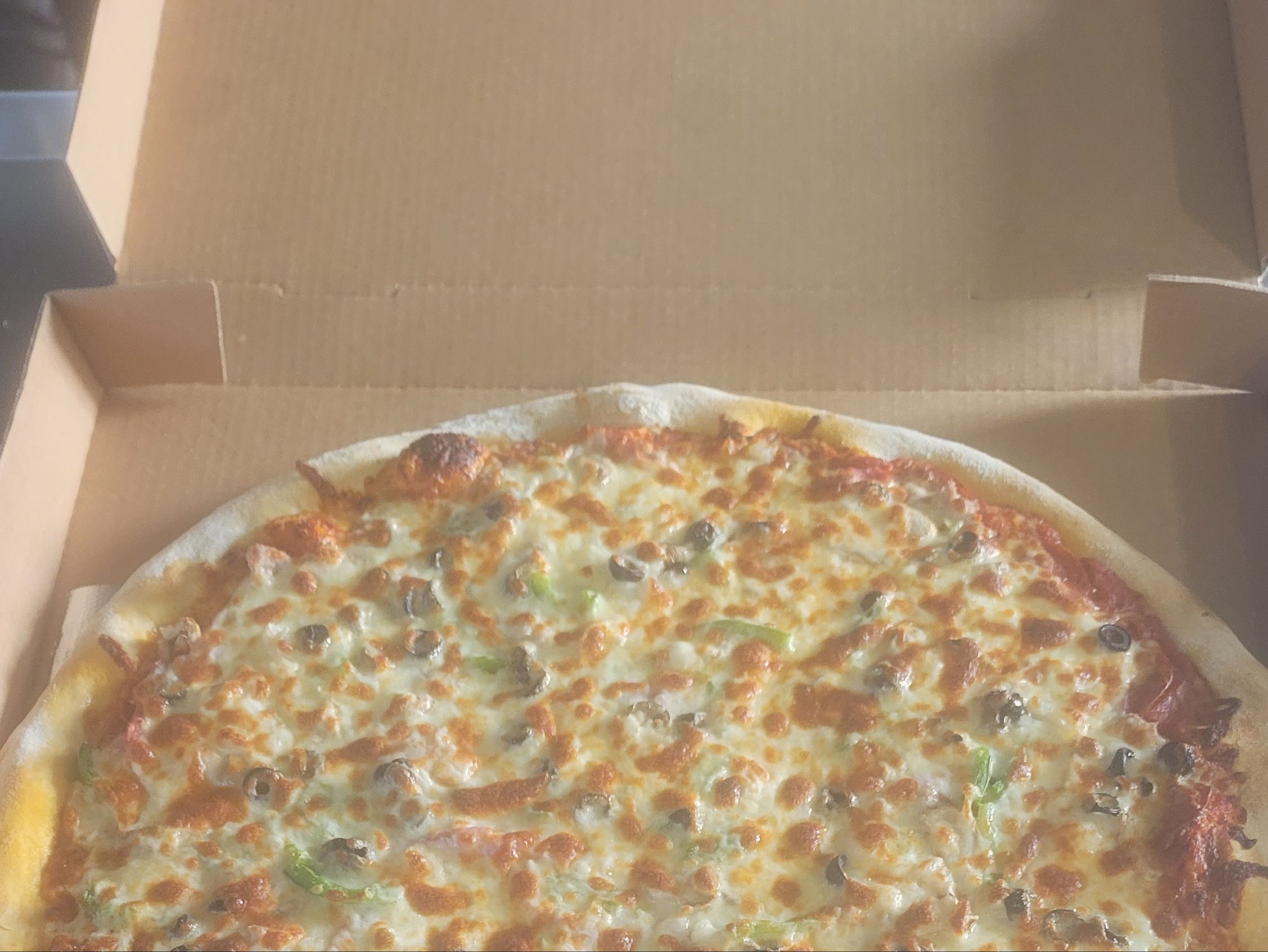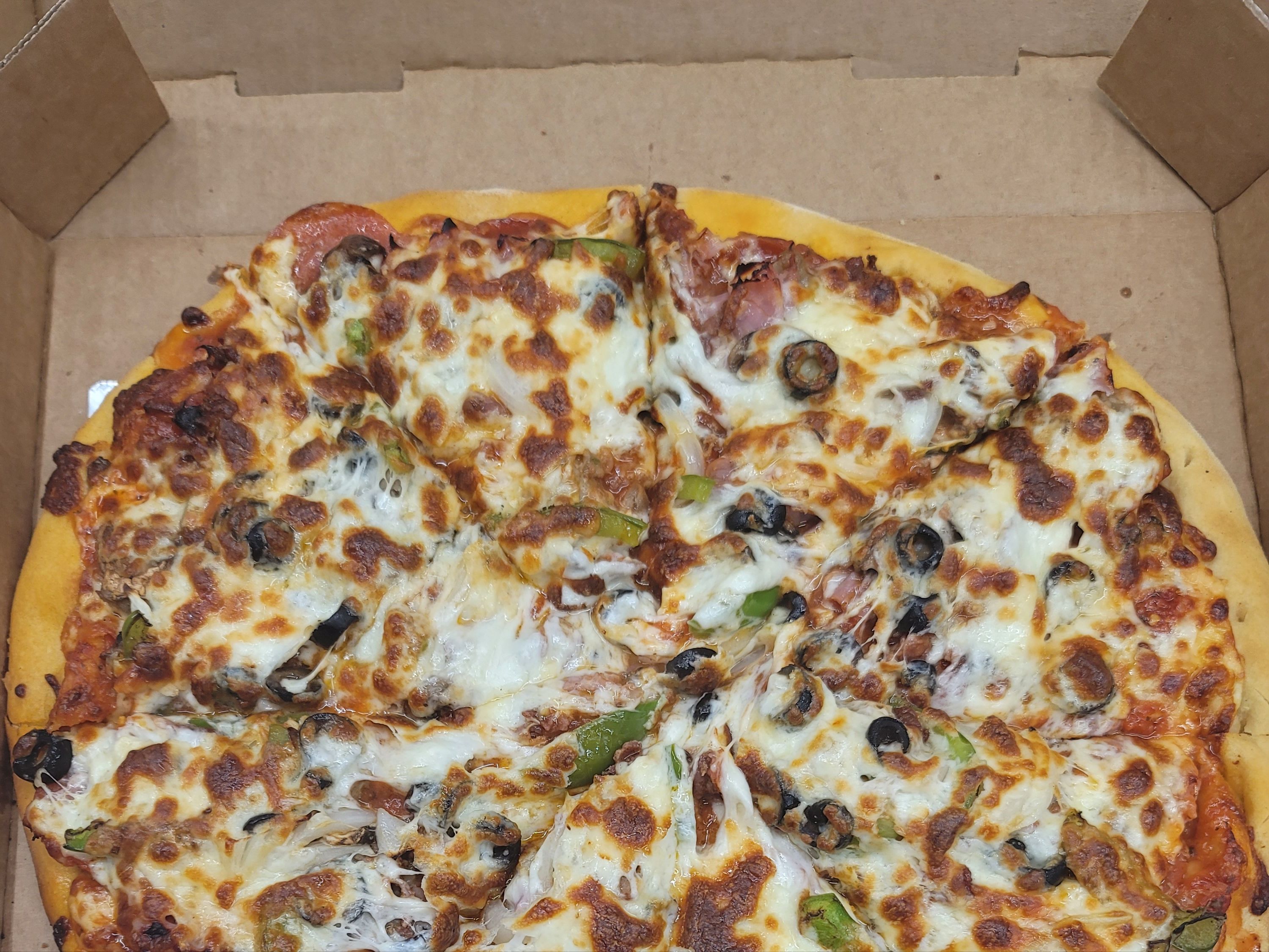 Pepperoni, sausage, ham, mushrooms, onions, green peppers and black olives with mozzarella cheese