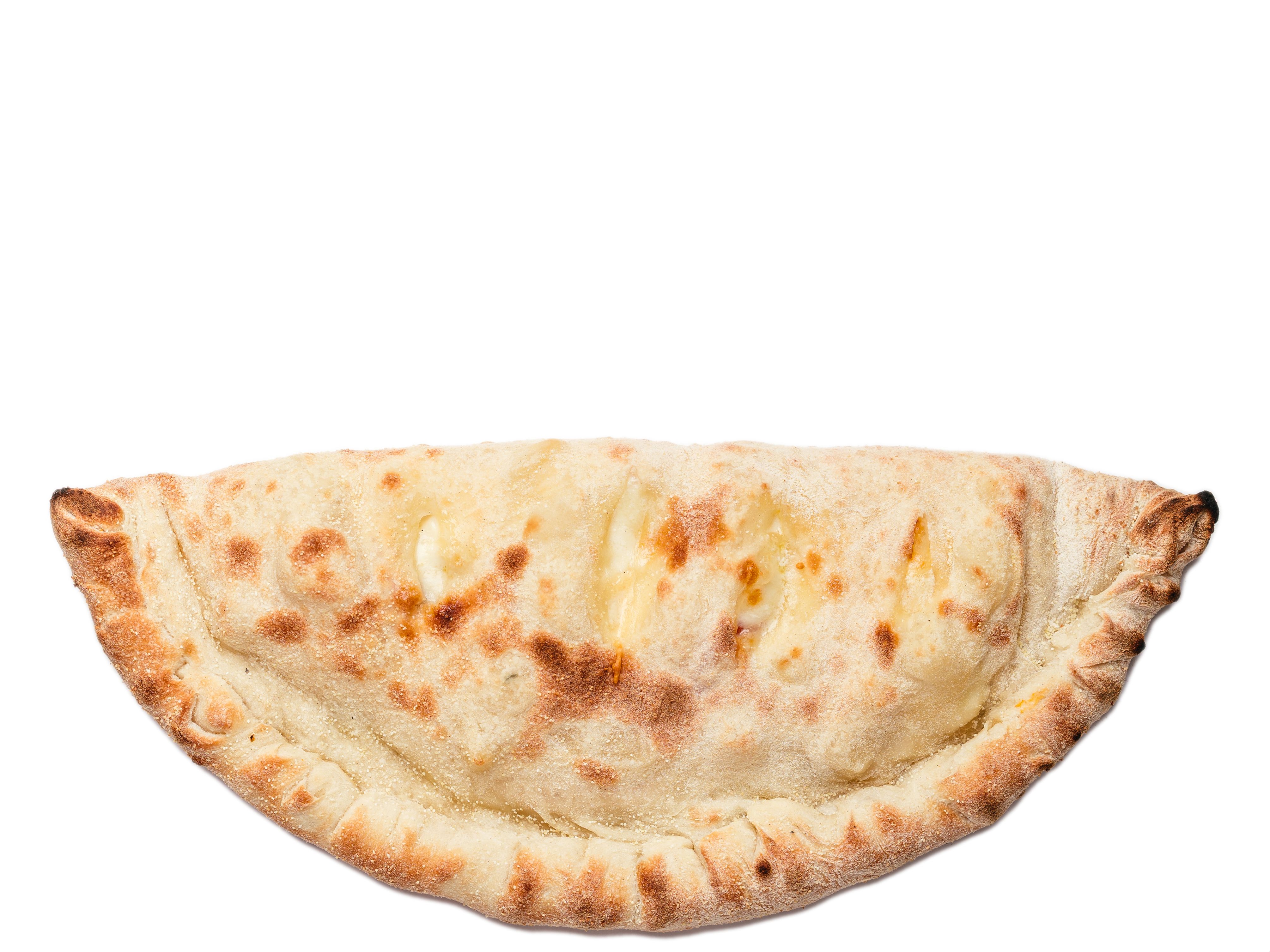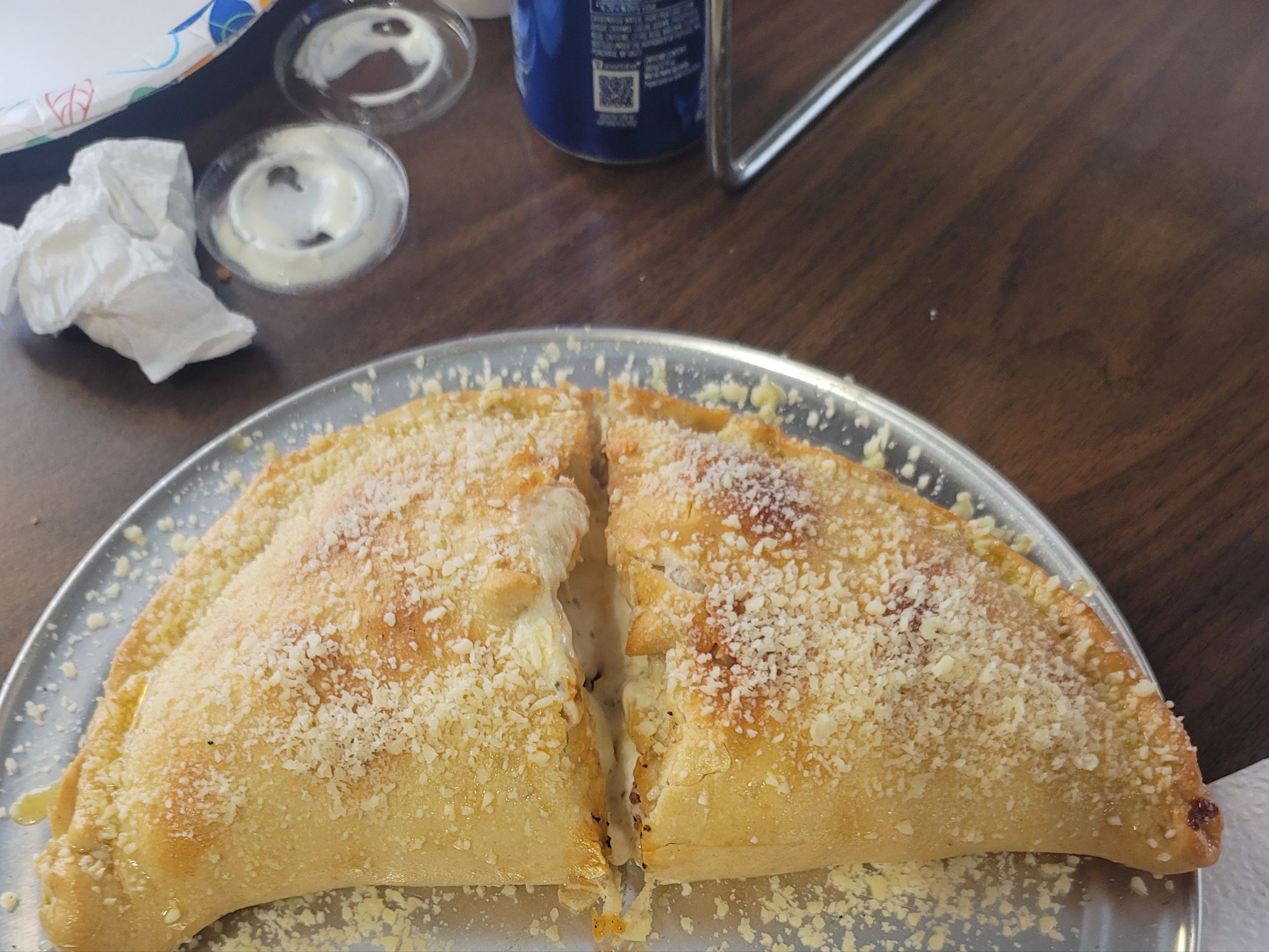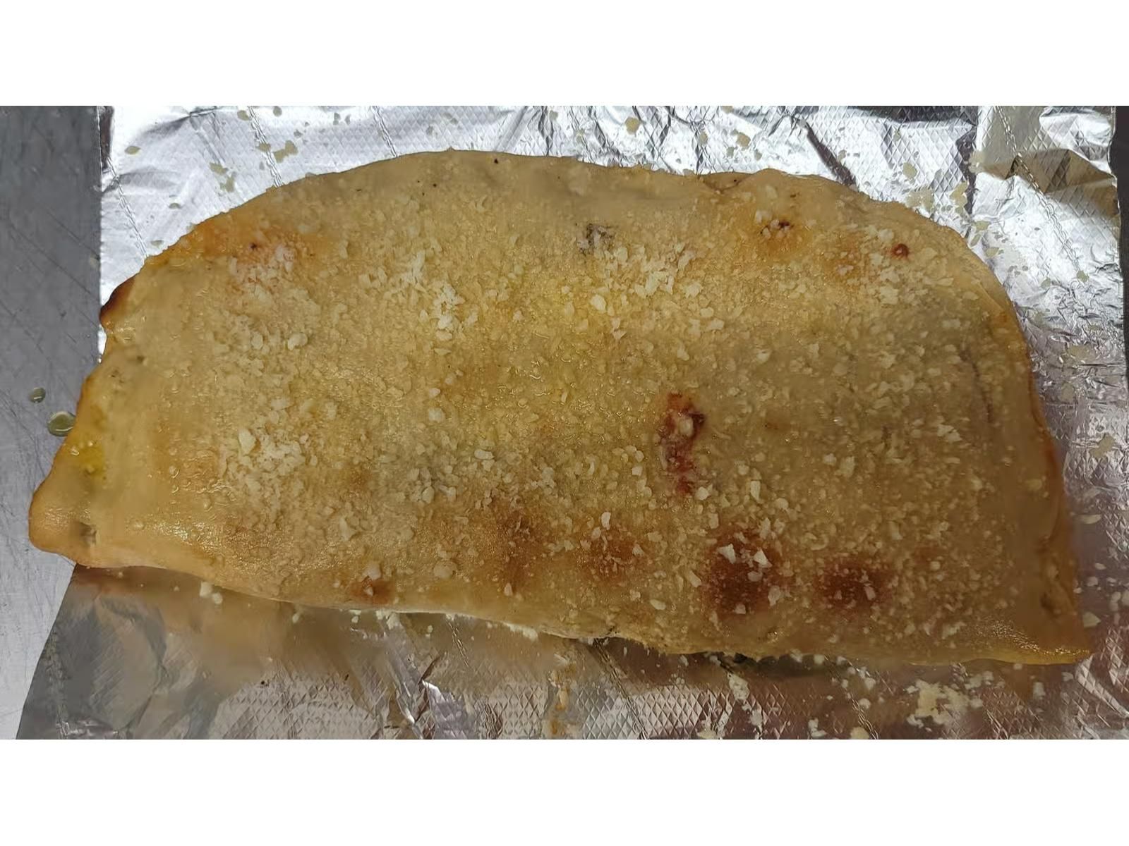 Chicken bacon ranch calzone. Comes with chicken, bacon, ranch. Garlic and Parmashon on top served with a side of ranch for dipping