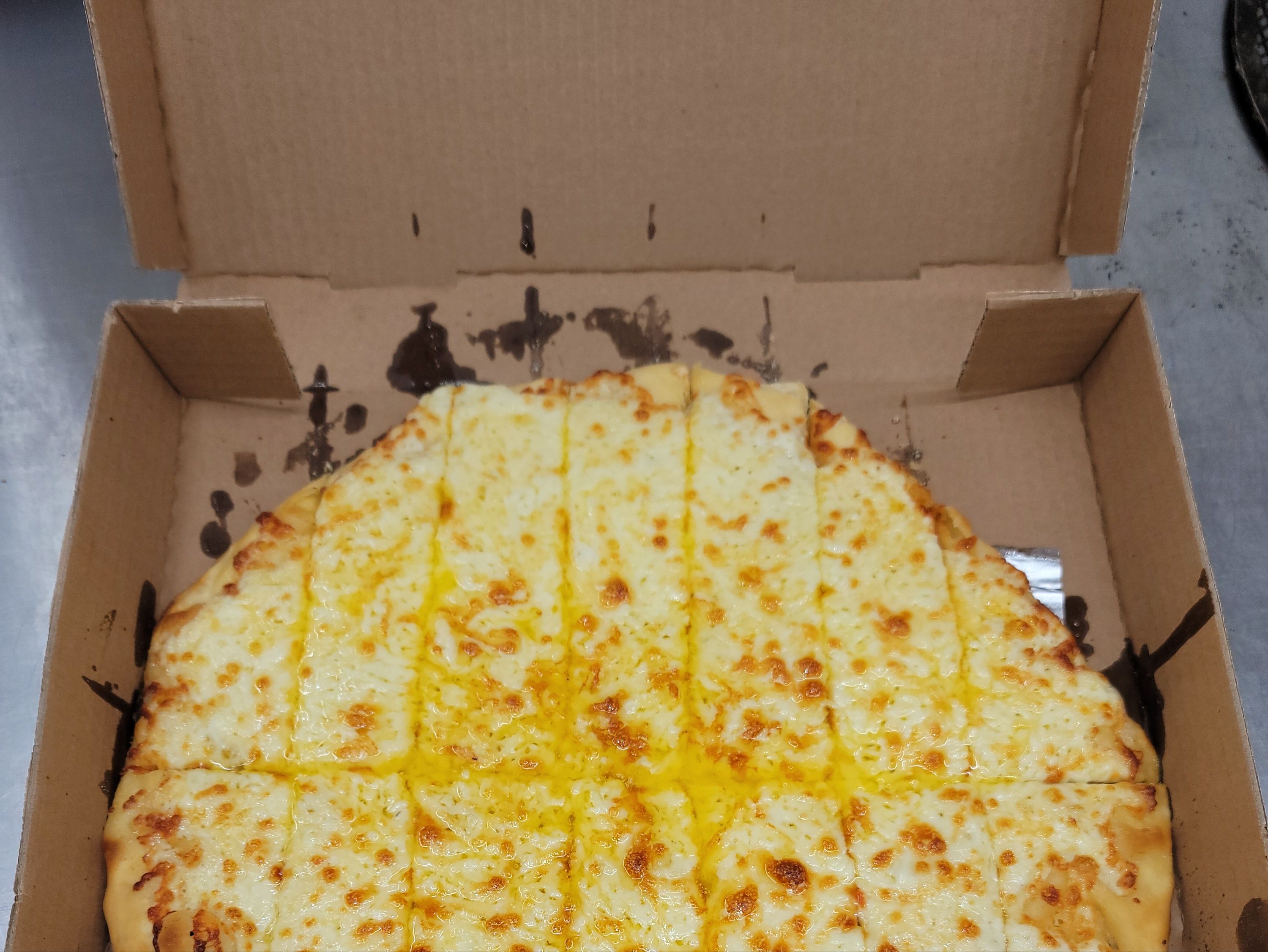 A 14" pizza dough rolled thin with garlic sauce and mozzarella cheese. Served with with pizza sauce to dip