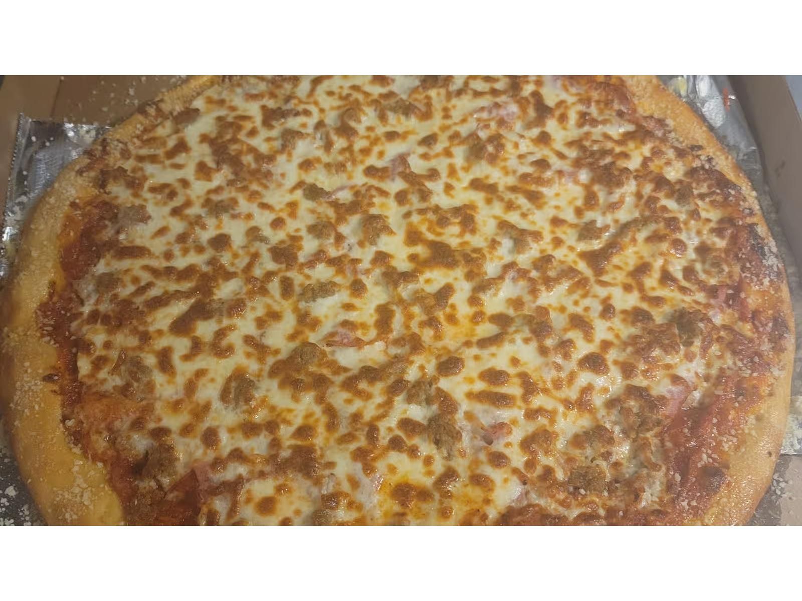 20" loaded meats loaded with pepperoni, sausage, ham, bacon, meatballs and mozzarella cheese