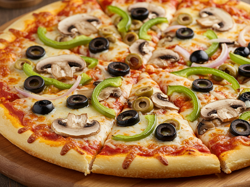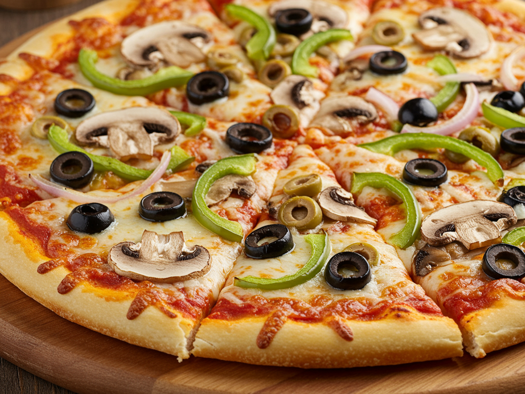 Veggie pizza comes with mushrooms, onions, green peppers, black and green olives and mozzarella cheese