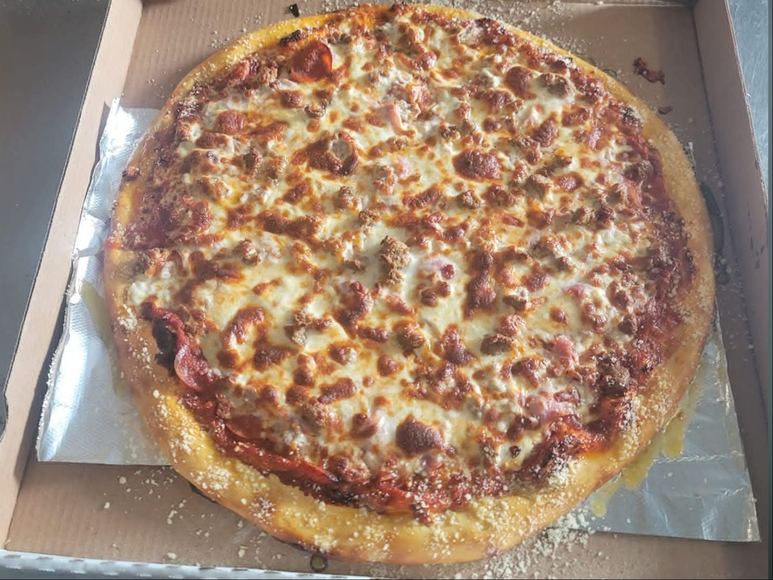 Pepperoni, sausage, ham, bacon, meatballs and mozzarella cheese