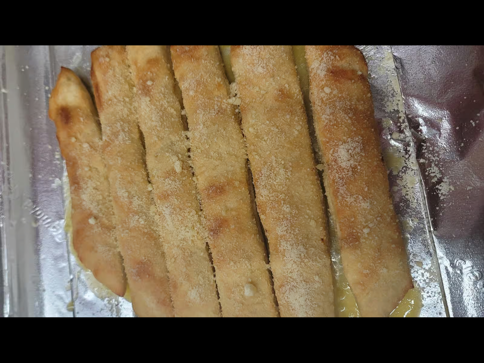 6 breadsticks with garlic and Parmashon on them with dipping sauce
