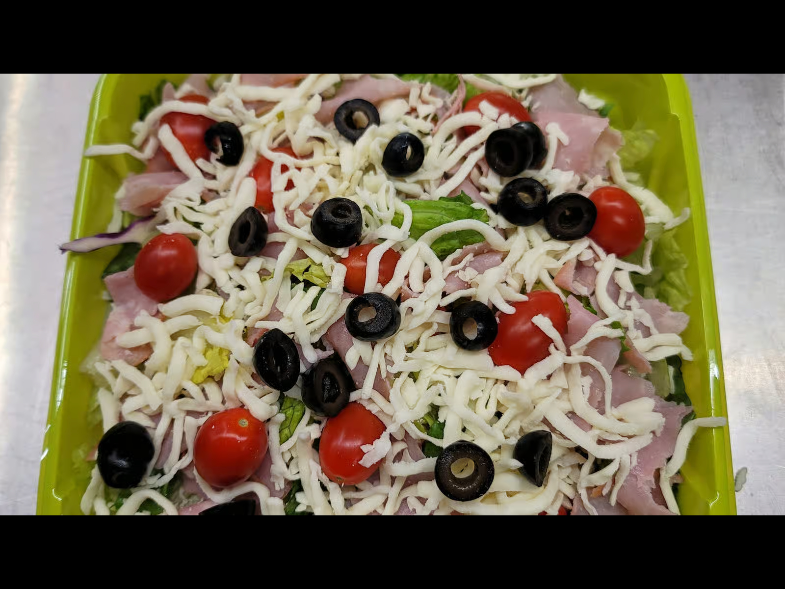 Chef salad includes salad, ham, tomatoes, black olives, and cheese serves with your choice of dressing